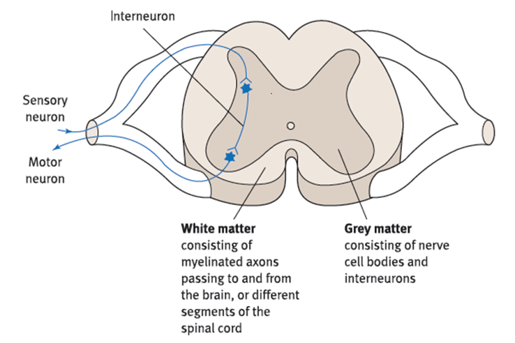 - It is referred to as the grey matter due to its greyish appearance. The neuron cell bodies are concentrated here giving the colour.